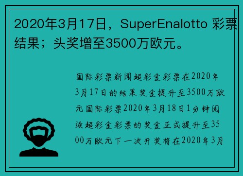 奇趣分分彩游戏规则超彩金彩票的奖金正式提升至3500万欧元,下一次开奖将在2020年3月19日进行。
